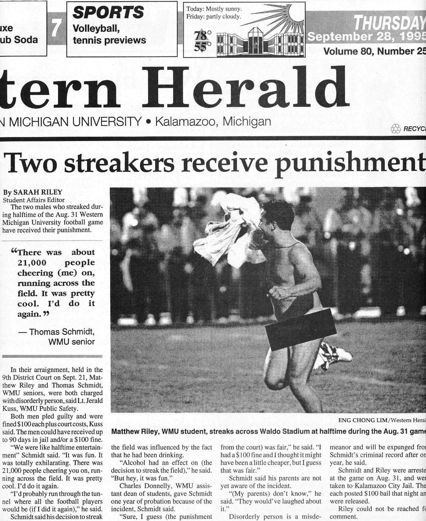At the Western Michigan University football game on August 31, 1995, I was in the Waldo Stadium field along with several professional photographers on assignment for our respective newspapers/organizations.  In the drizzle, I was trying to keep my equipment dry using a plastic bag that once contained a loaf of bread.  With a Nikon F3HP mounted on a MD4 motor drive and Nikkor AF 300mm f/4 lens, I was lucky to have captured in sharp focus one of the two streakers running across the field. The film used was Kodak Tri-X that was push processed from ISO 400 to ISO 1,600.